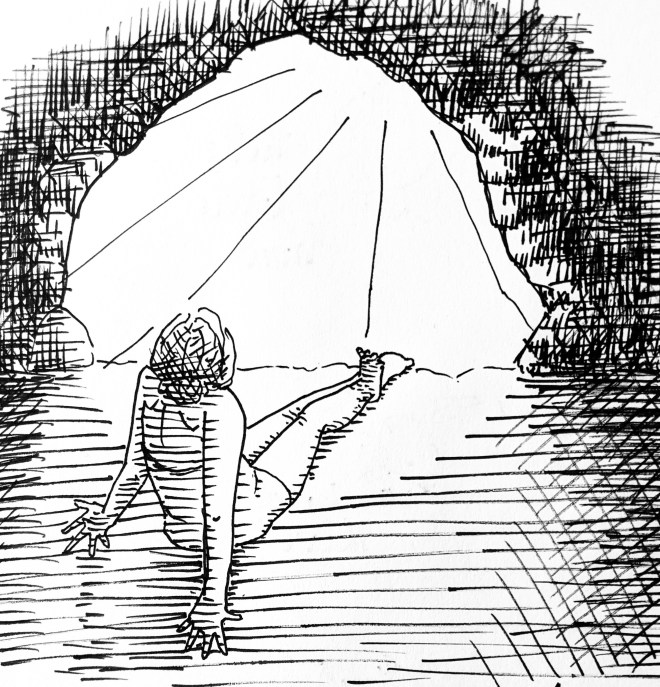 Beneath me and suddenly close, my partner makes a noise of irritation. I hear the tone more than the words. I hadn’t noticed but the women in the water had noticed his brown back naked in the sun and he was suddenly embarrassed. Earlier, I’d heard what was probably him, having a loud and un-self-aware piss in the smaller stream. He works, doing things because they feel nice, getting in to the rhythm of the day. The women had broken that, and he’s grumpy-faced. I can’t see him but in my head I can picture his hunched shoulder, wide-armed kid-face. The laughing from the women is friendly, laughing more at his little-boy attitude.